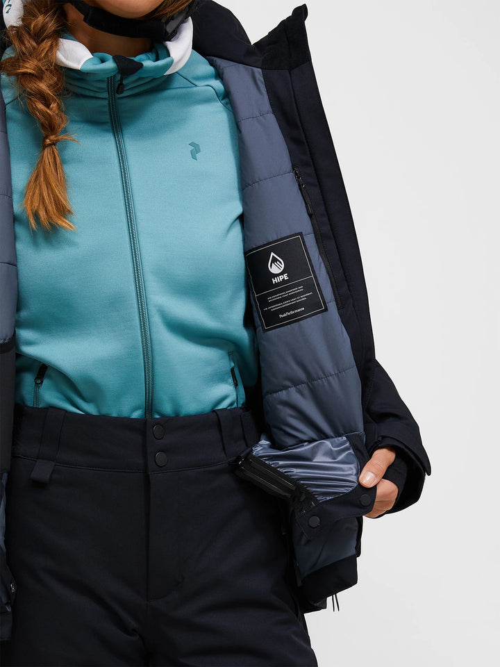 De Peak Performance Anima HIPE® 2L Insulated Shell Jacket Women in Zwart is een hoogwaardige dames ski- en winterjas die warmte, bescherming en bewegingsvrijheid combineert voor intensieve wintersportactiviteiten. Deze jas is ontworpen om optimale prestaties te leveren bij koude en wisselende weersomstandigheden.